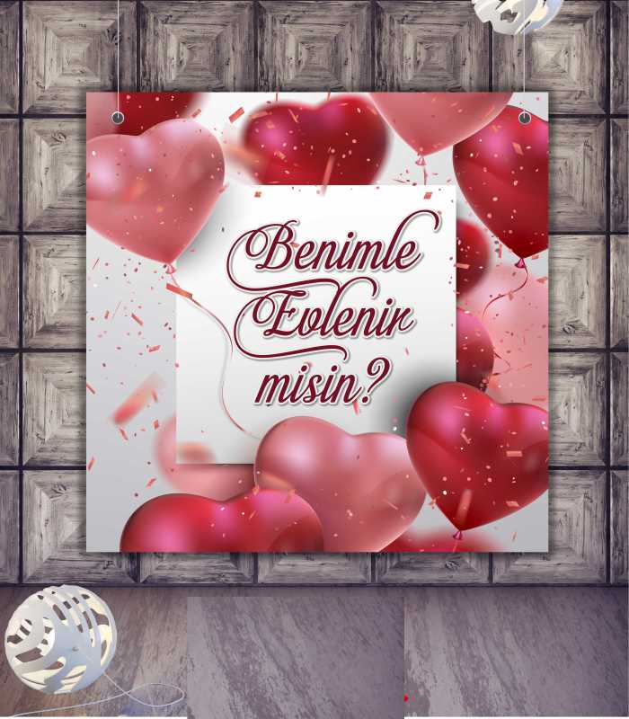 Beyaz Pembe Kalpli Benimle Evlenir Misin Afişi, tatlı pembe tonları ve beyaz zeminle saf bir romantizmi temsil eder. Yumuşak renk geçişleri, sıcak bir atmosfer yaratır. Özellikle sade dekorlu organizasyonlarda duygusal bir hava katar.