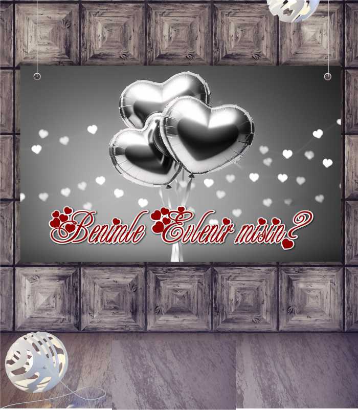 Gri Gümüş Balonlu Evlilik Teklifi Afişi, gümüş tonlarının modern ve “cool” havasını balon temasıyla birleştirir. Gri zemin ve gümüş balon detayları, sade ama etkileyici bir teklif sahnesi kurmak isteyenler için idealdir. Özellikle gümüş folyo balon, beyaz mum ve minimal dekorlarla uyumu çok yüksektir; fotoğraf çekimlerinde temiz ve şık bir fon sağlar.