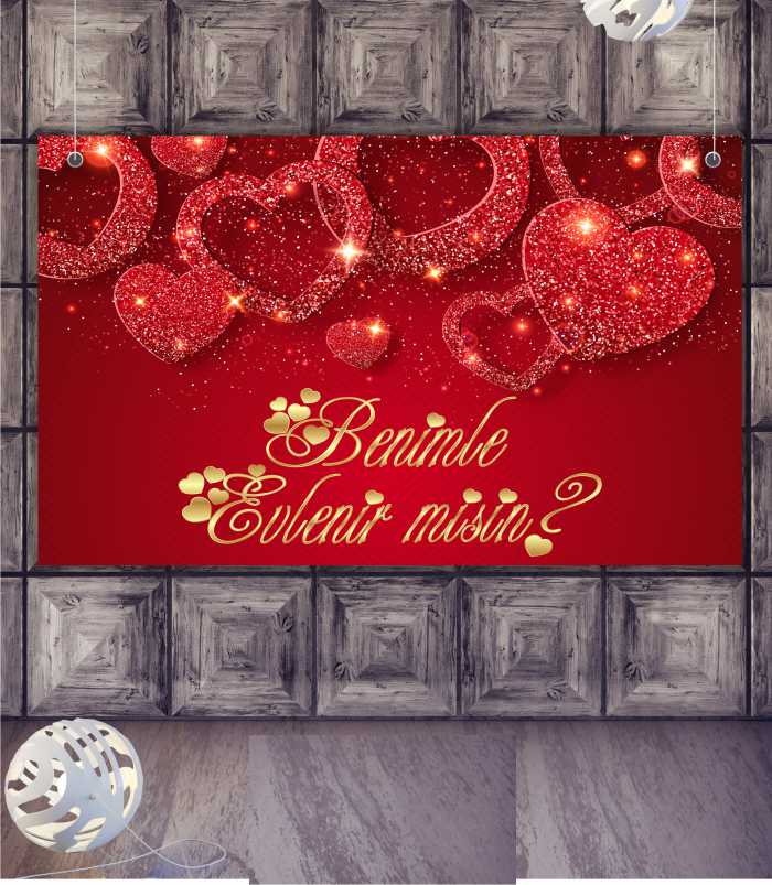 Kırmızı Simli Kalpler Evlilik Teklifi Afişi, parıltı hissi veren simli kalp detaylarıyla teklif anına ışıltılı bir hava katar. Özellikle balon, mum ve led ışık konseptleriyle birleştiğinde sahneyi daha “kutlama” havasına sokar. Sim etkisi, fotoğraflarda daha canlı ve eğlenceli bir görünüm oluşturur; teklif köşesini tek dokunuşla zenginleştirir.